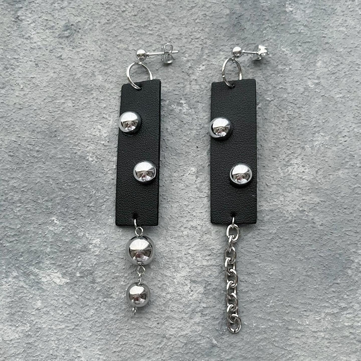 ブラック レザー アシンメトリー シルバー ピアス/イヤリング| marimo-モノトーンカラーのハンドメイドピアス・アクセサリー
