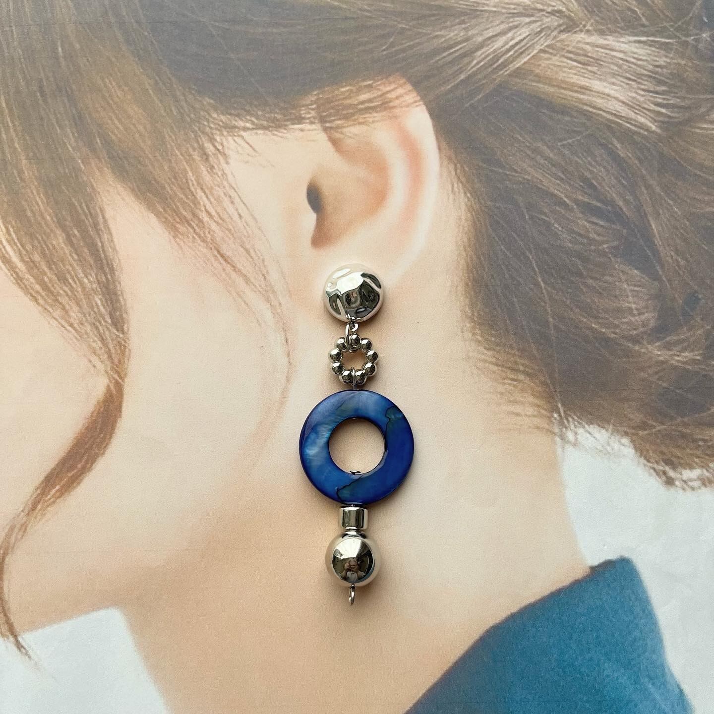 ブルーのリングを使ったシルバーのアシンメトリーピアスです。